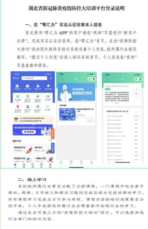 各级疫情防控机构和专兼职人员需下载“鄂汇办APP”,完成“新用户注册”,实名认证后登录。在“鄂汇办”乐鱼买球·(中国)官方网站,点击“疫情防控大培训”滚动图片跳转至培训系统完善个人信息,根据自己所属行业据实填写,系统按照不同行业需求自动分配必修课程,一门课程中包含若干课时,视频、文字讲义和课后习题均完成后视为完成该课时学习,所有课程学习完成后方可参与考核。经线上考核合格的参训人员可获得培训合格证明。