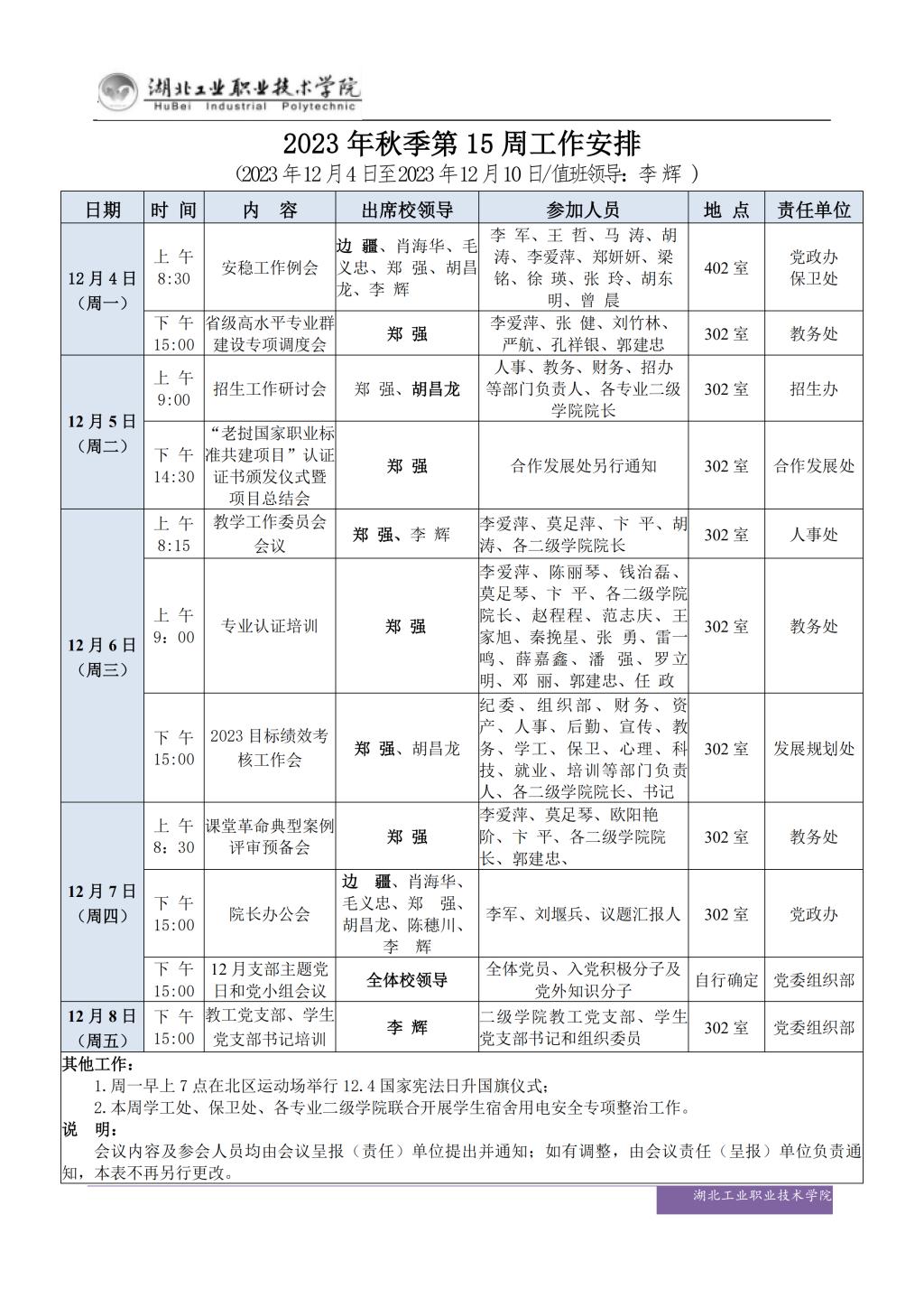 2023年秋季第15周工作安排
