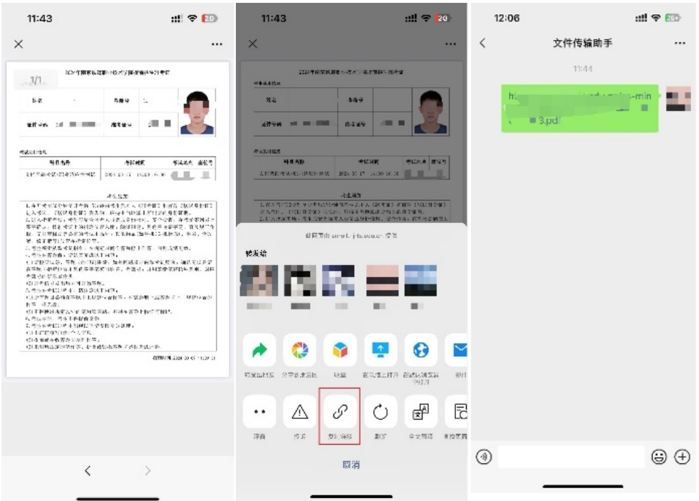 6.3.1 苹果手机:点击右上角的"..."按钮后,在浮窗内点击"复制链接",在微信内粘贴链接。点击访问该链接后,随时可以查看自己的准考证信息,也可以将该链接发送给打印店以进行打印。