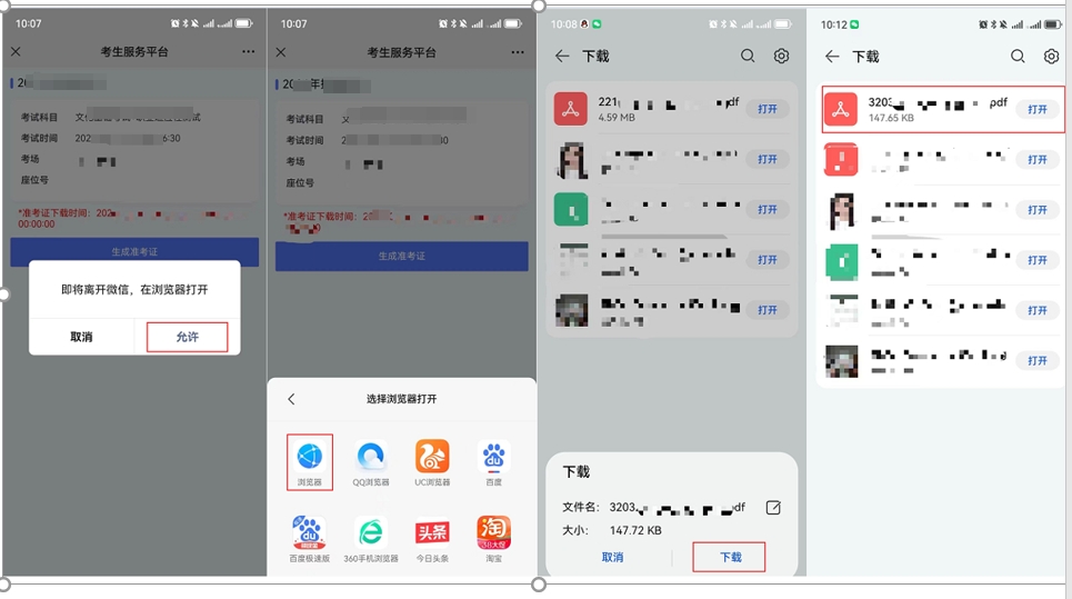 6.3.2 安卓手机:点击"允许"按钮后,选择指定的浏览器软件后,再次点击"下载"按钮,等待一段时间后,pdf文件就下载到了手机上,此时可以在浏览器的下载列表中打开文件,也可以发送文件给打印店以进行打印。