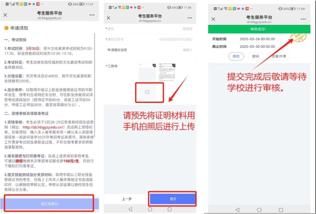 请各位考生于2025年3月28日至3月29日期间登陆考生服务平台(http://nh.hbgyzy.edu.cn/zs_mobile/index.html#/)按要求依次完成注册登录、单招政策性加分材料上传、考试缴费、签订考生承诺书及准考证下载打印。无符合加分条件政策材料的考生可以跳过此项操作。详细操作流程见附件操作手册。