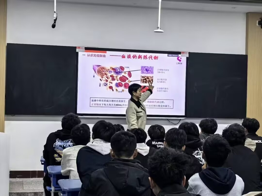 宣讲现场,十堰市中心血站资深讲师团结合专业背景与工作经历,围绕血液知识与安全、献血政策与流程以及十堰市2026年1月1日即将正式实施的无偿献血“三免”政策,通过图文并茂的PPT、生动有趣的科普视频以及真实感人的献血者故事,为同学们带来一场场生动深入的无偿献血知识普及课。在互动环节,同学们就献血前后注意事项、献血间隔期、特殊血型需求等踊跃提问,血站工作人员均给予了专业、细致地解答,现场气氛热烈。